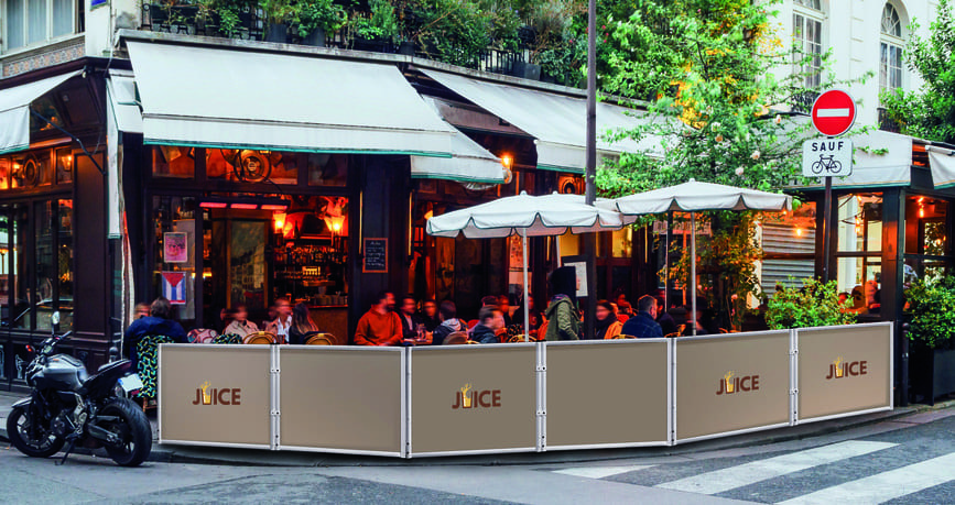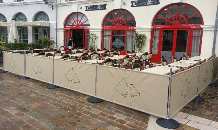 Die Separatoren bestehen aus hochwertigen, wetterfesten Stoffen, die UV-beständig, farbecht und schnell trocknend sind. Sie lassen sich in modulare Rahmen einfügen und optional mit Befestigungsprofilen montieren, sodass sie sowohl fix als auch mobil nutzbar sind. Farben, Muster und Stoffarten können nach Wunsch gewählt werden, um zur Markenidentität Ihres Hauses zu passen oder ein stilvolles Ambiente zu schaffen.