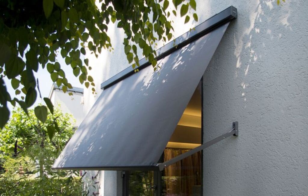 Die Fallarm-Markise ist speziell für Fenster konzipiert. Durch den ausgestellten Arm bleibt die Sicht nach draußen erhalten, während die schräge Tuchführung die Hitze effizient abhält.