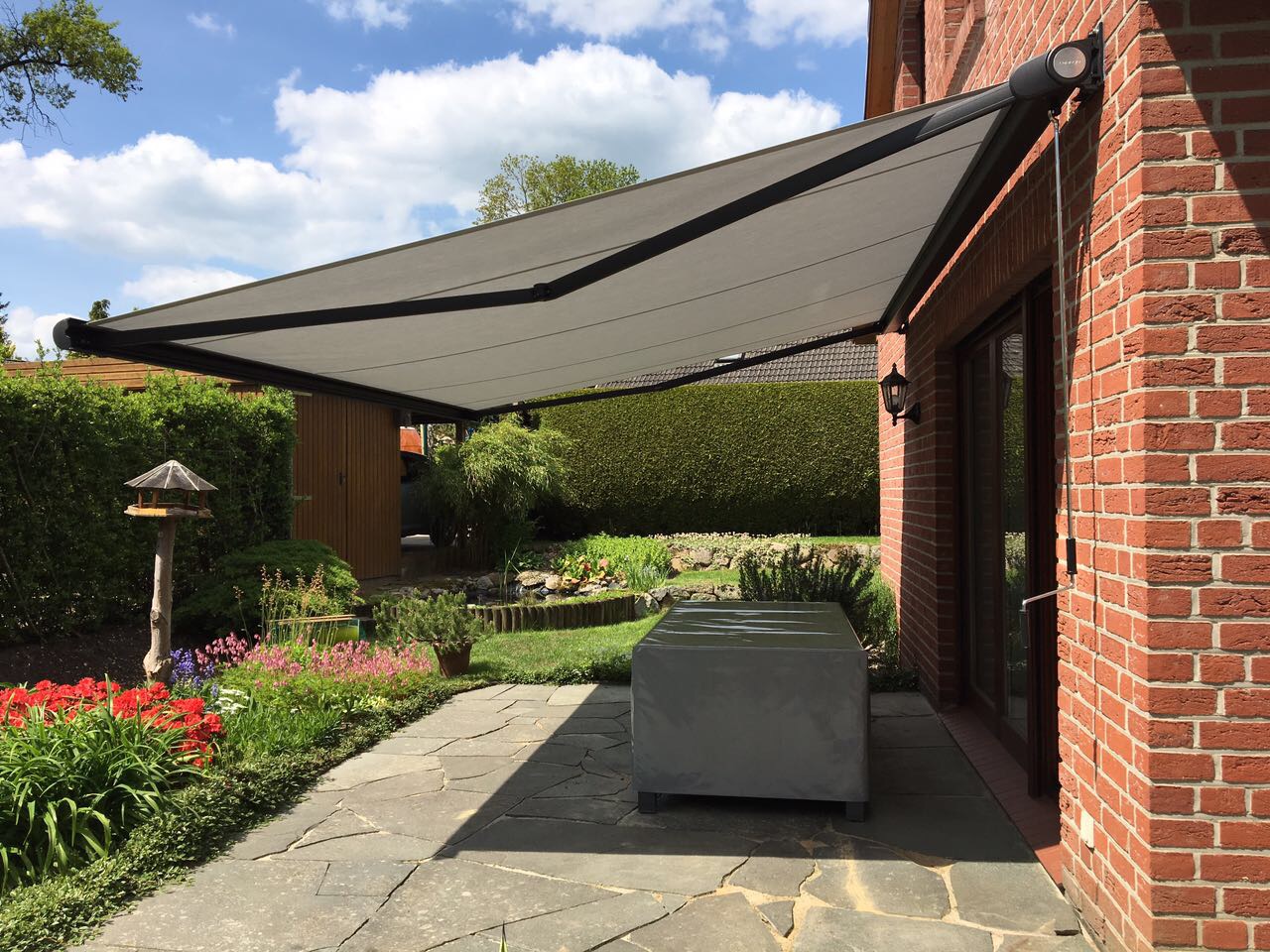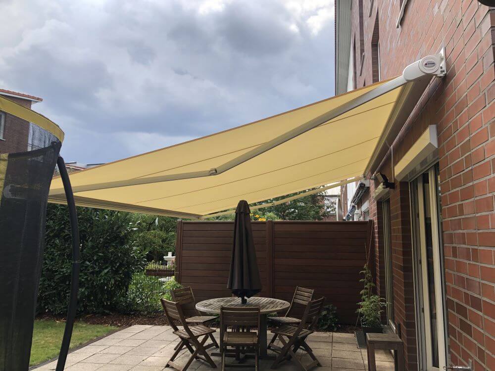 Je nach Ausführung sind große Spannweiten und Ausladungen möglich, sodass auch breite Terrassen zuverlässig beschattet werden können.