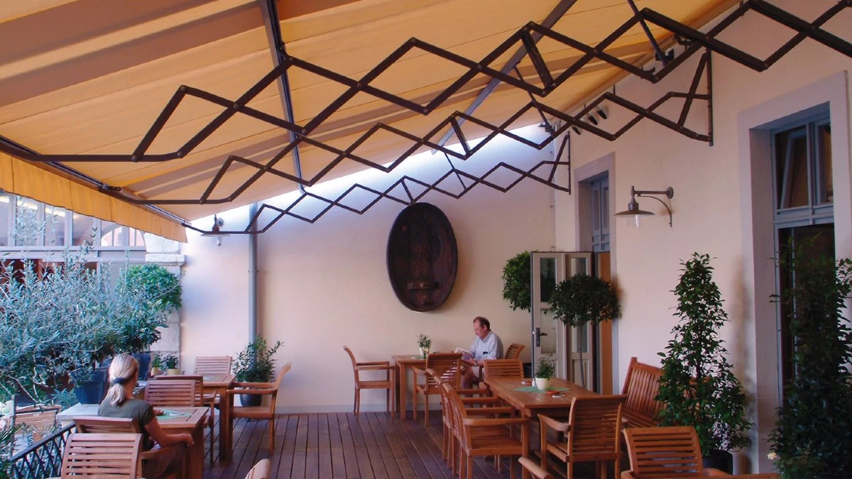 Mehr Tragfähigkeit und größere Ausfälle mit weniger sichtbarem Tragarrohr, charakteristisches historisches bzw. elegantes Design, oft besser geeignet für große Breiten oder traditionelle Fassaden, insbesondere in der Gastronomie.