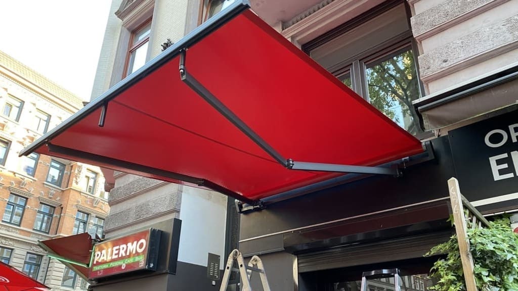Ja – gerade durch ihre platzsparende Konstruktion ist sie ideal für den Einsatz in der Gastronomie oder Hotellerie, zum Beispiel für Außenterrassen oder Cafés, die nur wenig Platz über der Fassade zur Verfügung haben.