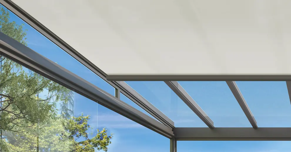 Die UG200 wird direkt unter einem Terrassen- oder Wintergartendach montiert und schützt vor direkter Sonneneinstrahlung, ohne den Lichteinfall vollständig zu blockieren.