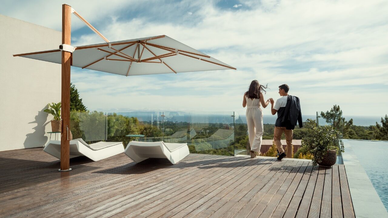 Ziemlich lange haben wir nach einem Namen für diesen Sonnenschirm gesucht. Fündig sind wir beim Synonym für Ausstrahlung geworden. Im Garten nimmt der Aura nicht nur Raum ein, sondern verbreitet sofort ein Flair von Geborgenheit. Grund dafür sind seine Materialien wie pulverbeschichtetes Aluminium, vernickeltes Messing, Edelstahleinsätze in warmen Silbertönen und das sorgfältig verarbeitete Eukalyptusholz. Dank spezieller Lackschichten auf dem Mast als auch dem stabilisierenden Aluminiumkern, hält der Aura ein Schirmleben lang. Selbstverständlich lässt er sich leicht öffnen. Bei tief stehender Sonne oder neugierigen Blicken kann er gegen den Mast als auch 360° darum gedreht werden.