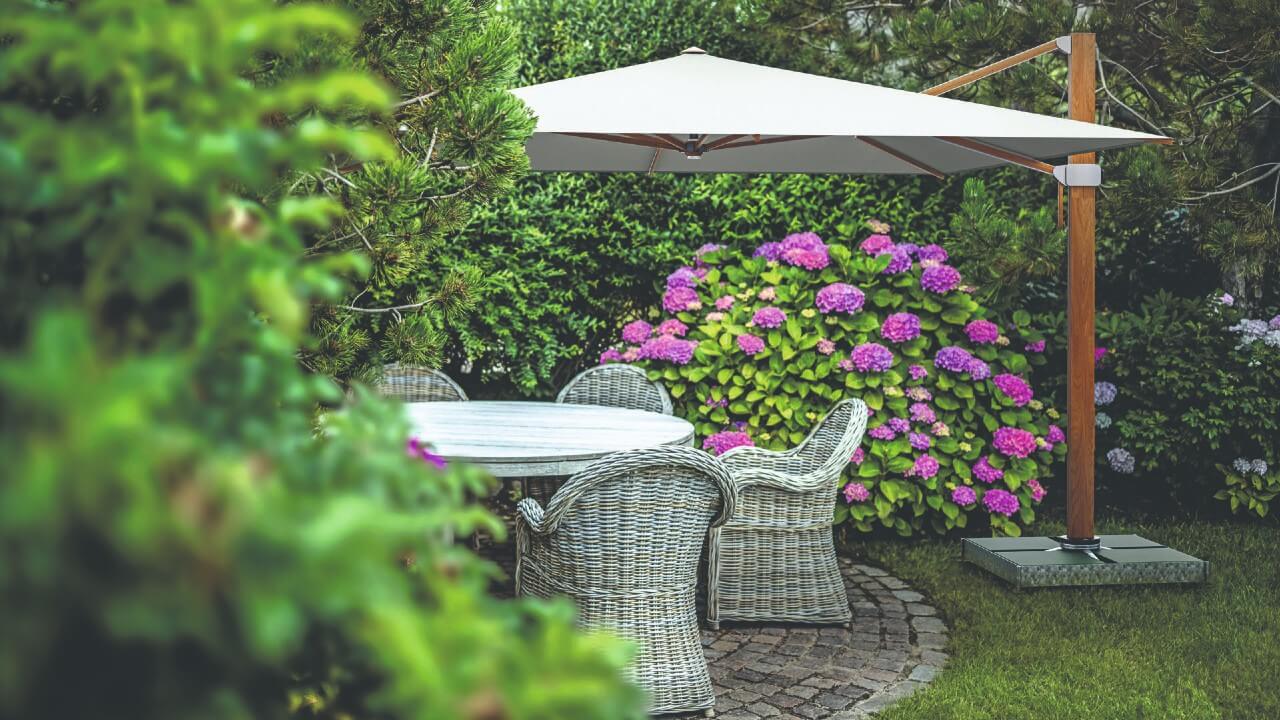 Die Streben des Ampelschirms sind aus Eukalyptusholz.