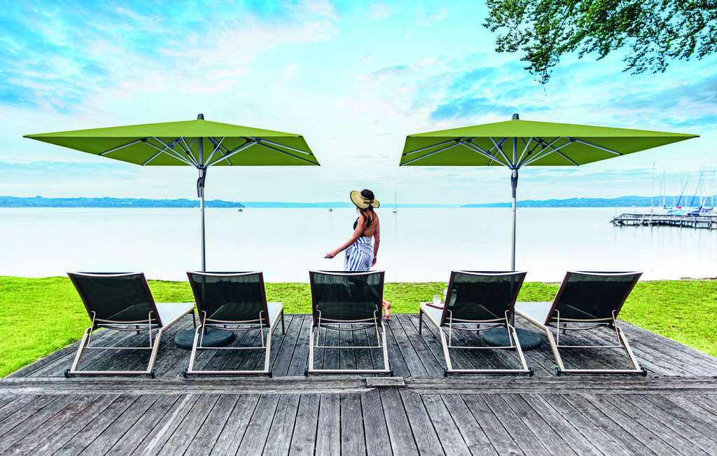 Er wird über ein patentiertes Spannhebel-System geöffnet. Diese Technik ermöglicht ein schnelles und kraftsparendes Öffnen und Schließen – ideal, wenn der Schirm im Gastronomiealltag mehrfach täglich bewegt werden muss.