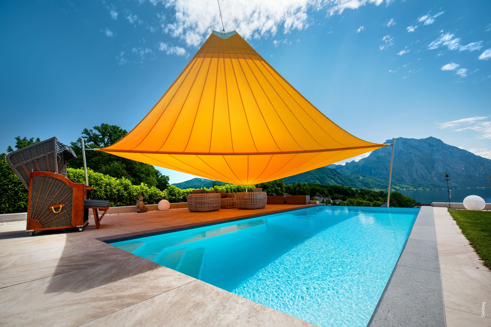 Das System ist ideal für große Flächen – mit einer Spannweite von bis zu 12×7 m (über 80 m²) eignet es sich hervorragend für Terrassen, Poolbereiche oder gastronomische Außenflächen.