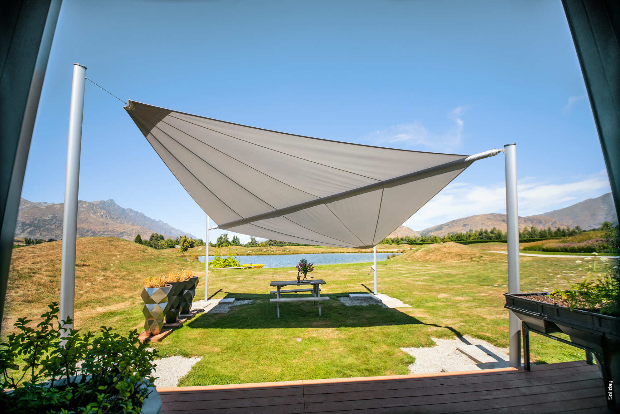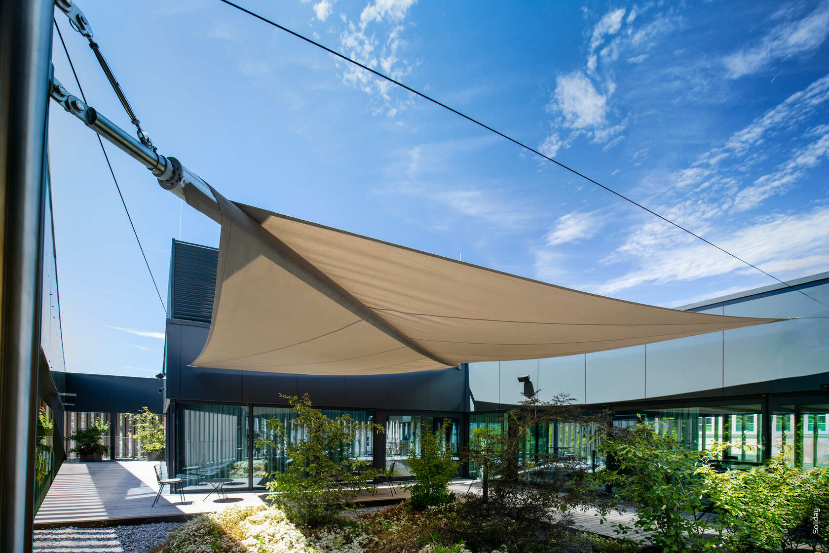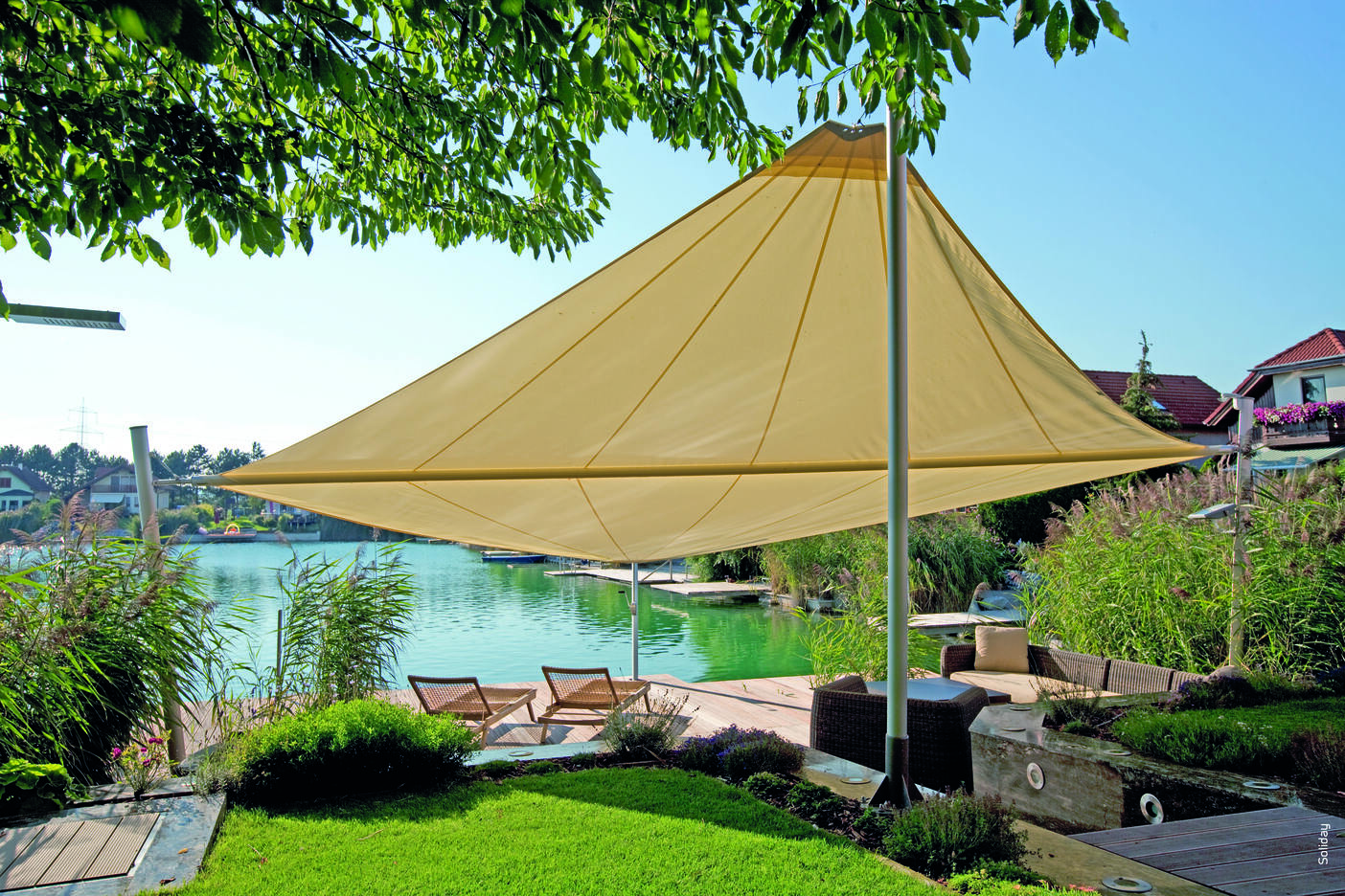 Bedienkomfort auf höchster Ebene bietet Ihnen das vollautomatische SOLIDAY-C. Wind- und Sonnensensoren sorgen für eine eigenständige, selbstregulierende Steuerung des Segelsystems und gewähren höchste Sicherheit auch in Ihrer Abwesenheit. Die individuelle Bedienung erfolgt bequem per Fernbedienung. Das diagonal aufrollende SOLIDAY-C beruht auf einer neuen, patentierten Technik der dynamischen Segelaufhängung. Plötzlich auftretende Belastungen wie z.B. starke Windböen oder extremer Regen werden von dem stets unter Spannung stehenden Sonnensegel abgefedert. Die dynamische Segelaufhängung ist der ausschlaggebende Faktor, dass SOLIDAY-C mit der richtigen Planung sowohl als Sonnen- als auch als Regenschutzsystem bestens geeignet ist.