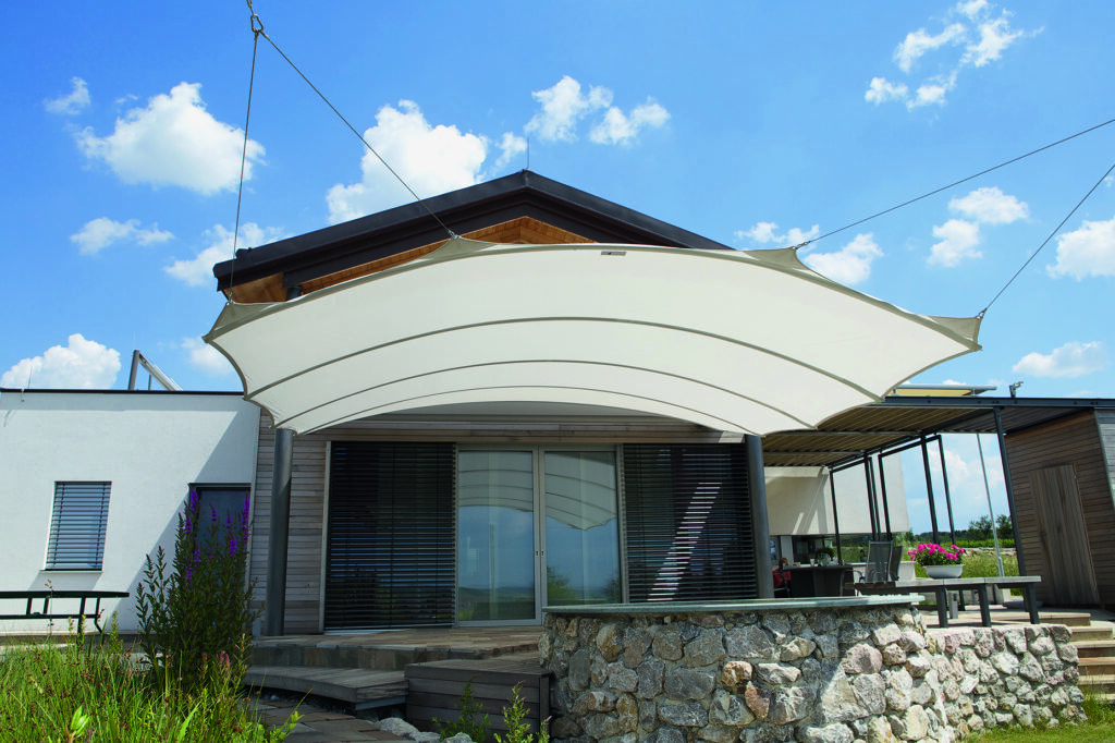 Jeder herkömmliche Sonnenschutz wie z.B. eine Markise muss mit einer ausreichenden Neigung zum Abführen des Regenwassers montiert werden. C4sun Segel verneigen sich nicht.