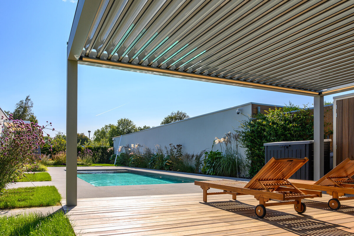 Das Skyroof Plus ist eine moderne Pergola mit drehbaren Lamellen, die als bioklimatische Überdachung für Terrasse oder Garten dient.